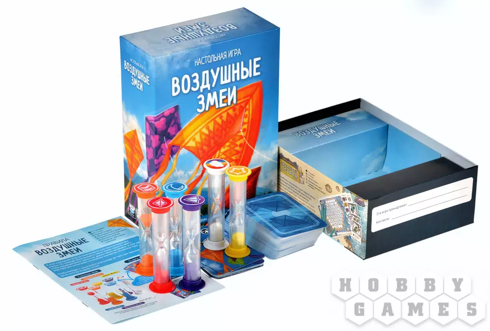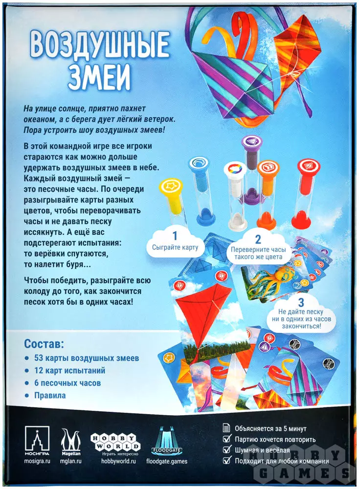 В шумной и весёлой командной игре "Воздушные змеи" вам и вашим друзьям предстоит как можно дольше удерживать в небе воздушных змеев. Они представлены в игре песочными часами, и пока песок ещё остаётся в верхней половине часов – змеи парят в небе. Не дайте им упасть! Переворачивайте часы, разыгрывая карты змеев, и дайте возможность воздушным красавцам парить в небе как можно дольше!