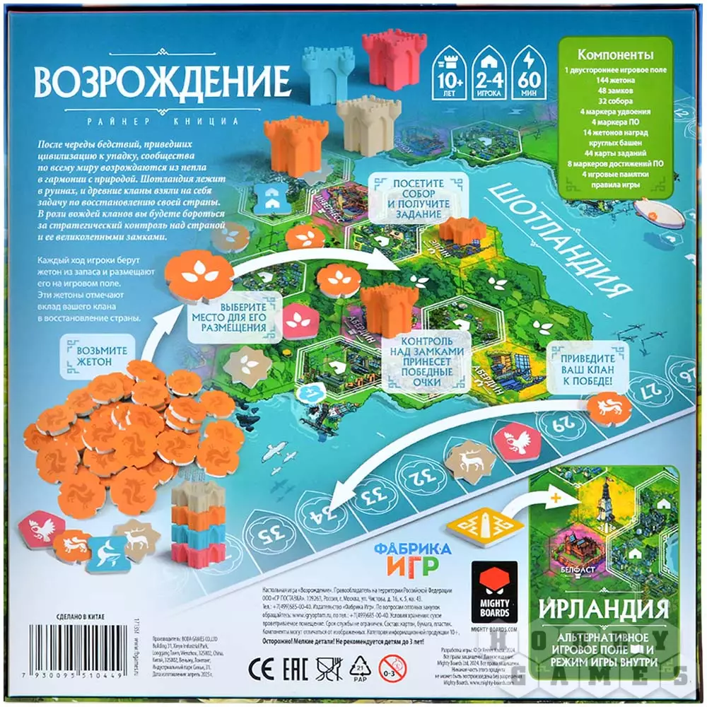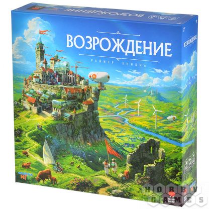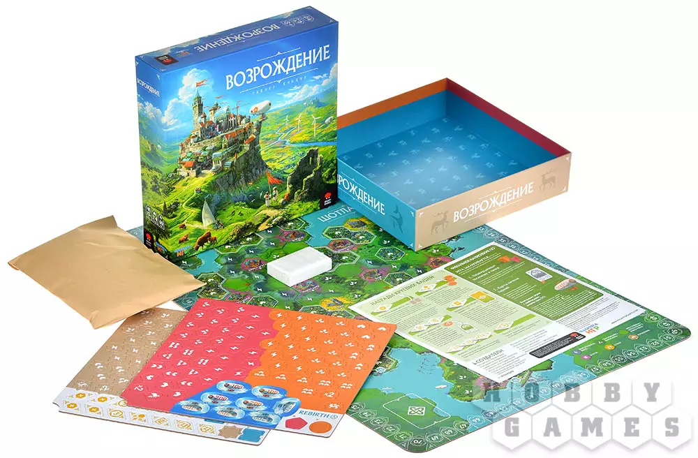 "Возрождение" – стратегическая евро-игра, которая сочетает простые правила с глубокими тактическими решениями. Игроки по очереди выставляют свои фишки на карту. Основная задача – создавать цепочки ферм для получения очков, основывать поселения разного размера для усиления контроля над регионами и окружать замки и соборы, чтобы получить за них дополнительные победные очки. Каждый ход – это тактический выбор: усилить свою сельскохозяйственную сеть, расширить поселение или перекрыть путь сопернику к ключевому объекту? Пространство ограничено, и к концу партии каждый ход становится решающим. Партия заканчивается, когда все игроки разместят свои жетоны. Подсчитываются очки за поселения, замки, задания и бонусные структуры. Победителем становится игрок, набравший наибольшее количество победных очков!