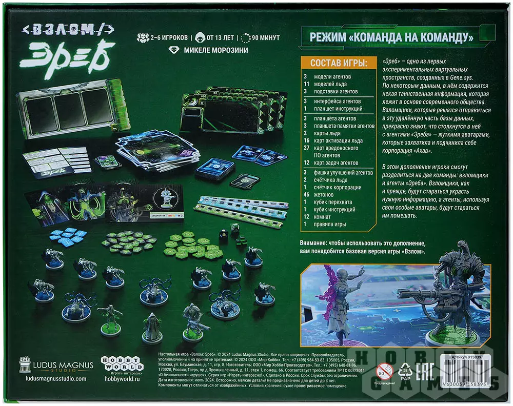 "Взлом: Эреб" – это дополнение к игре "Взлом" для 2-6 человек. Игроки разделятся на две команды: на команду хакеров, пытающихся пробиться сквозь виртуальный заслон, отделяющий их от крайне полезной информации, и агентов "Эреба", которые работают на корпорацию "Ахав" и изо всех сил стараются этому воспрепятствовать. Вас ждут новые детализированные 3D-аватары, которые помогут подчеркнуть, что в этой битве вы находитесь по разные стороны баррикад, комнаты и способности. В арсенале команды корпорации появится уникальная возможность управлять льдом – главными врагами серии. На чьей стороне окажется победа, а значит, и правда, зависит только от вас.