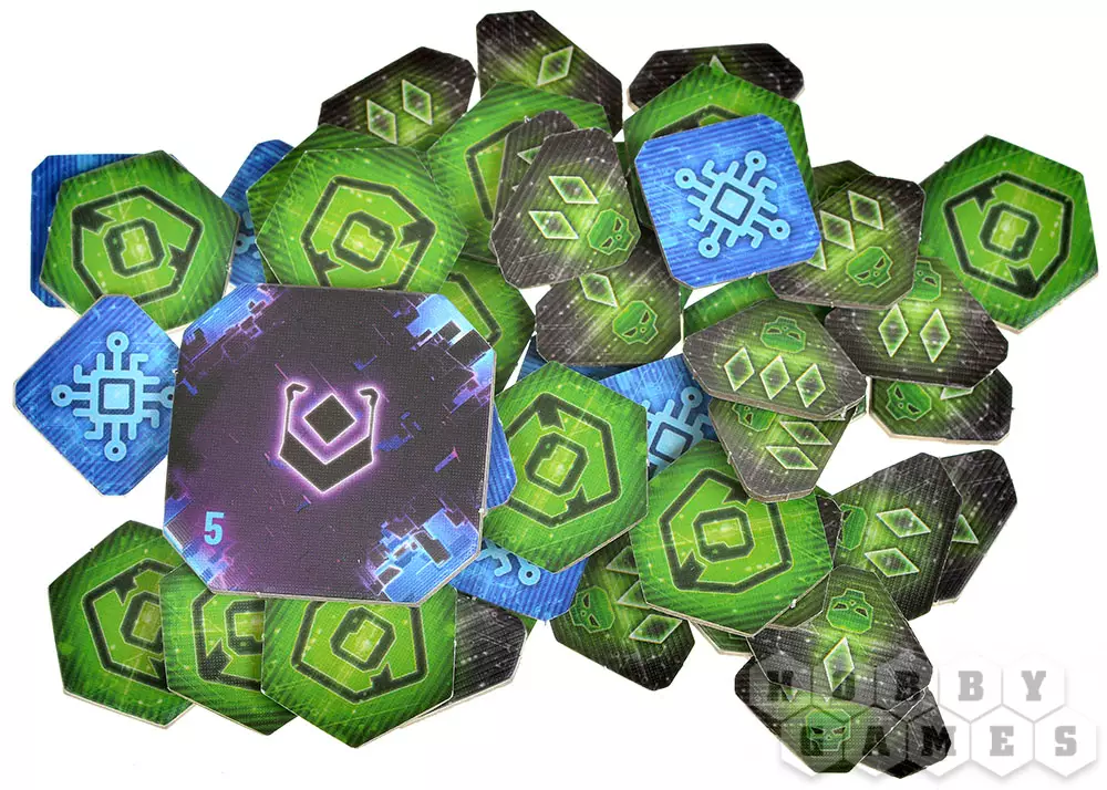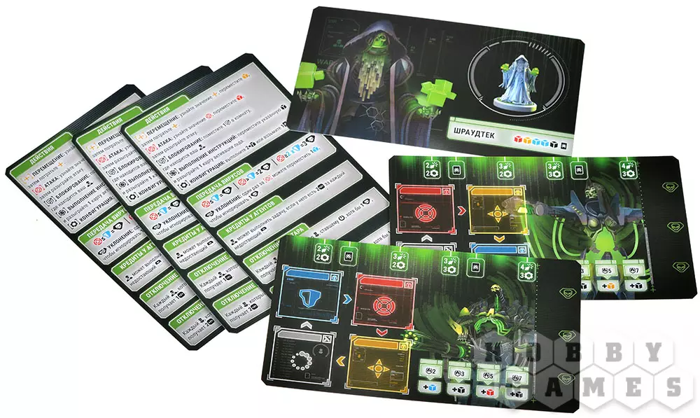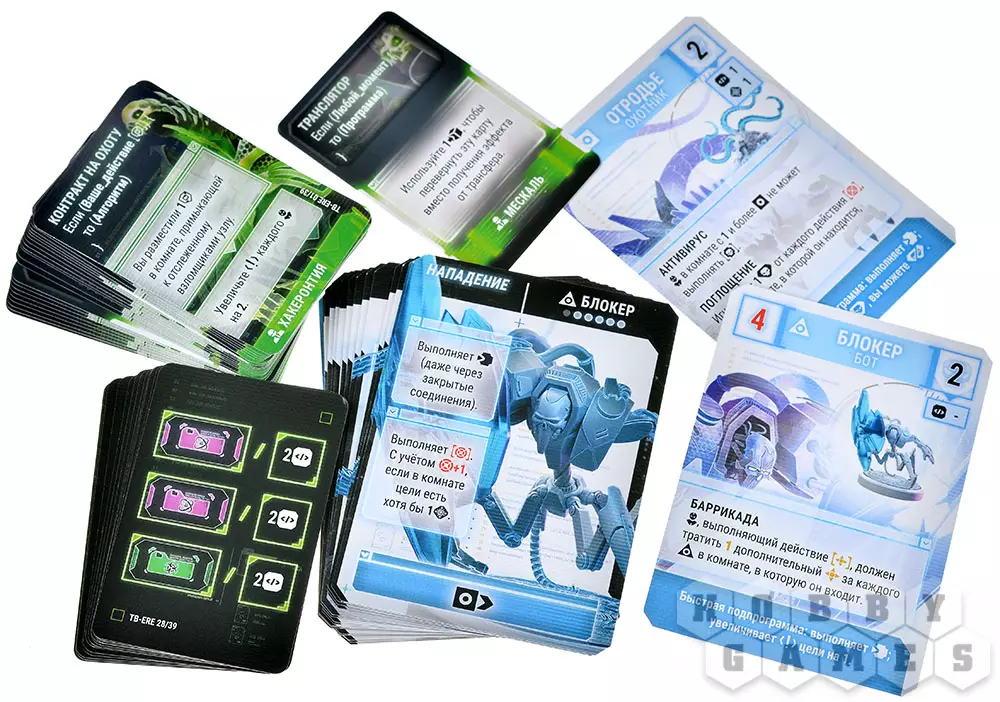 Уделим особое внимание фазе действий, так как это основная часть вашего хода. Вам доступны следующие варианты: перемещение с потенциальной возможностью раскрыть и активировать новую комнату, атака, экранирование (то есть защита), конфигурация (оптимизация ресурсов), заражение (размещение жетонов вирусов, которых у вас ограниченное количество, в комнатах базы данных; их количество повышает уровень вашей угрозы), выход (отключение аватара от системы), переподключение и улучшение (изменение характеристик с помощью соответствующих фишек и деки). Количество ваших действий ограничено значением кликов в слоте процессора, но тип вы можете выбирать сами.