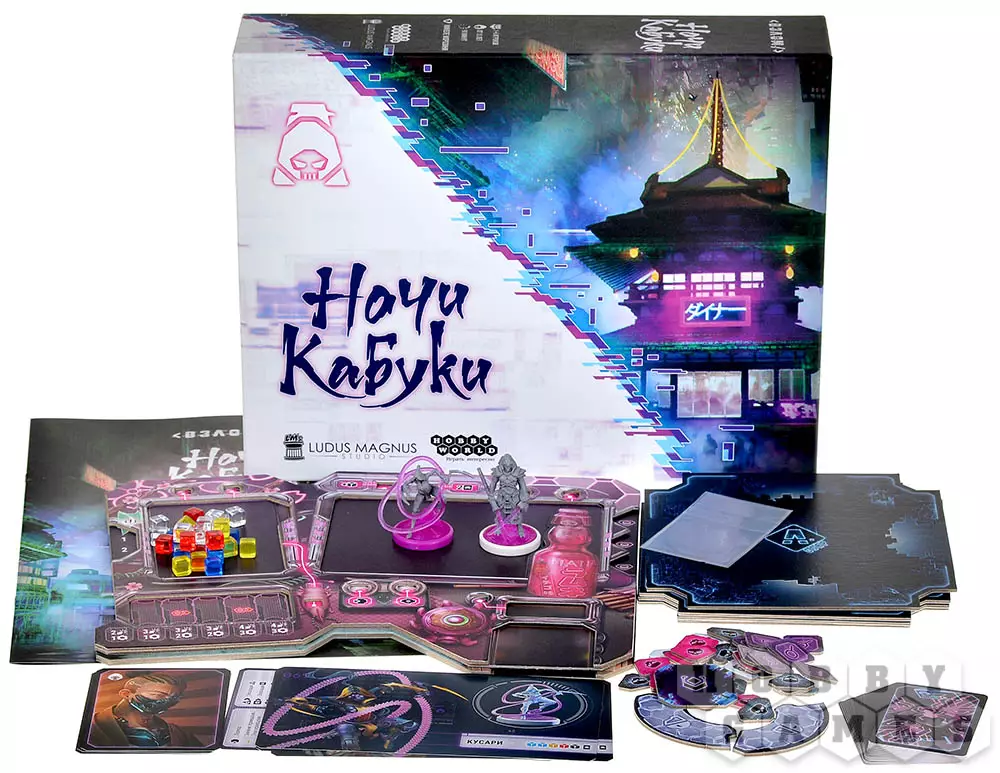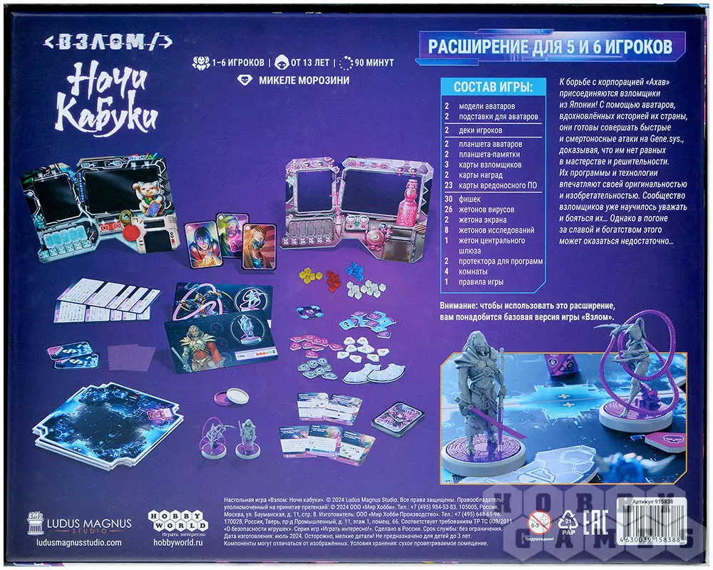 "Взлом: Ночи кабуки" – это расширение для 5 и 6 игроков к соревновательной настольной игре "Взлом". Вы станете счастливыми обладателями дополнительных детализированных 3D-аватаров и карт вредоносного ПО – теперь в тематике невероятной Японии. А вместе с ними у вас появится возможность расширить игровое поле, добавив новые комнаты и получать уникальные награды. Все нововведения можно использовать в любом игровом режиме и в сочетании с другими дополнениями. Теперь гонка за единоличное владение информацией станет ещё ожесточённее, а дух соперничества – сильнее!