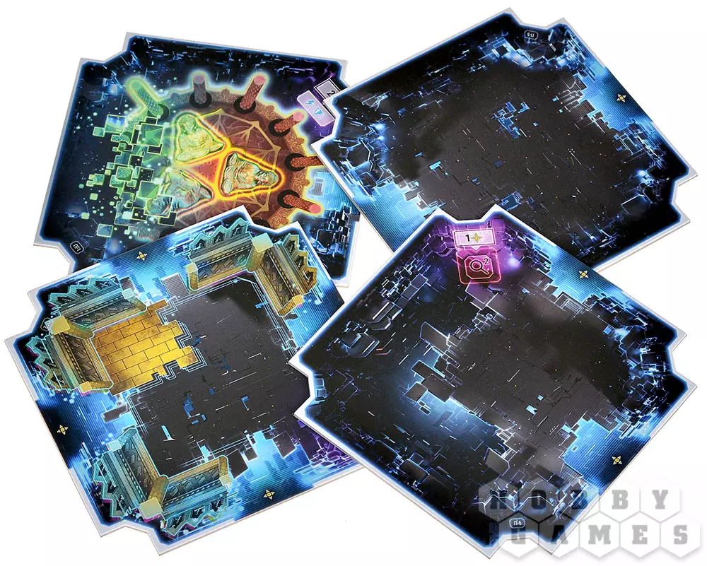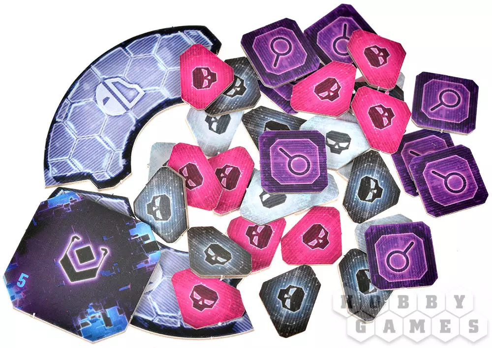 Уделим особое внимание фазе действий, так как это основная часть вашего хода. Вам доступны следующие варианты: перемещение с потенциальной возможностью раскрыть и активировать новую комнату, атака, экранирование (то есть защита), конфигурация (оптимизация ресурсов), заражение (размещение жетонов вирусов, которых у вас ограниченное количество, в комнатах базы данных; их количество повышает уровень вашей угрозы), выход (отключение аватара от системы), переподключение и улучшение (изменение характеристик с помощью соответствующих фишек и деки). Количество ваших действий ограничено значением кликов в слоте процессора, но тип вы можете выбирать сами.