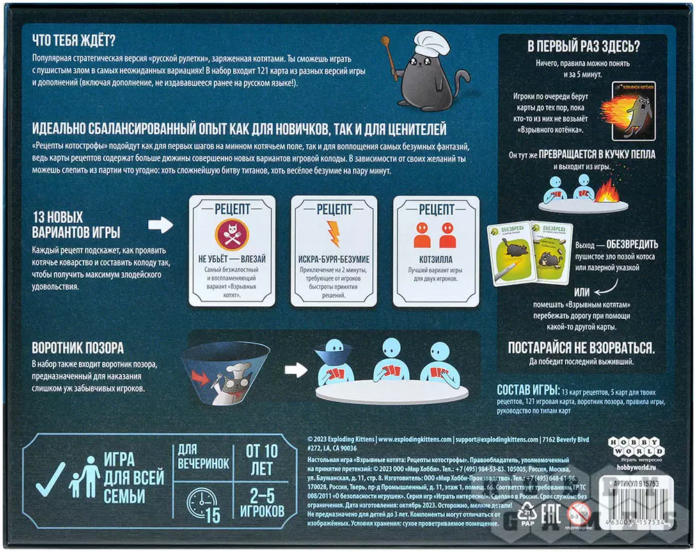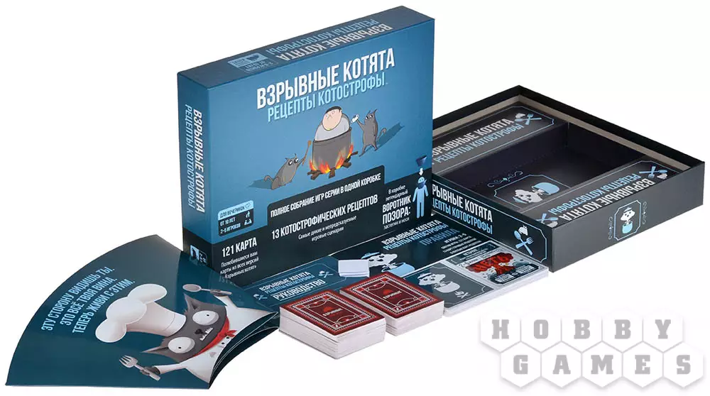 Да-да, вы всё правильно поняли: "Взрывные котята: Рецепты котострофы" включает в себя 121 карту из других версий игры и дополнений (даже из тех, что ранее не издавались на русском языке)! Прекрасно сбалансированный микс для опытных новичков и начинающих мастеров. Или наоборот. Но главная изюминка "Рецептов котострофы" сокрыта в самих картах рецептов, которые предлагают целых 13 новых вариантов игры! Каждый рецепт обладает уникальными нотками, которые обязательно захочется распробовать. Только чур карты не жевать!