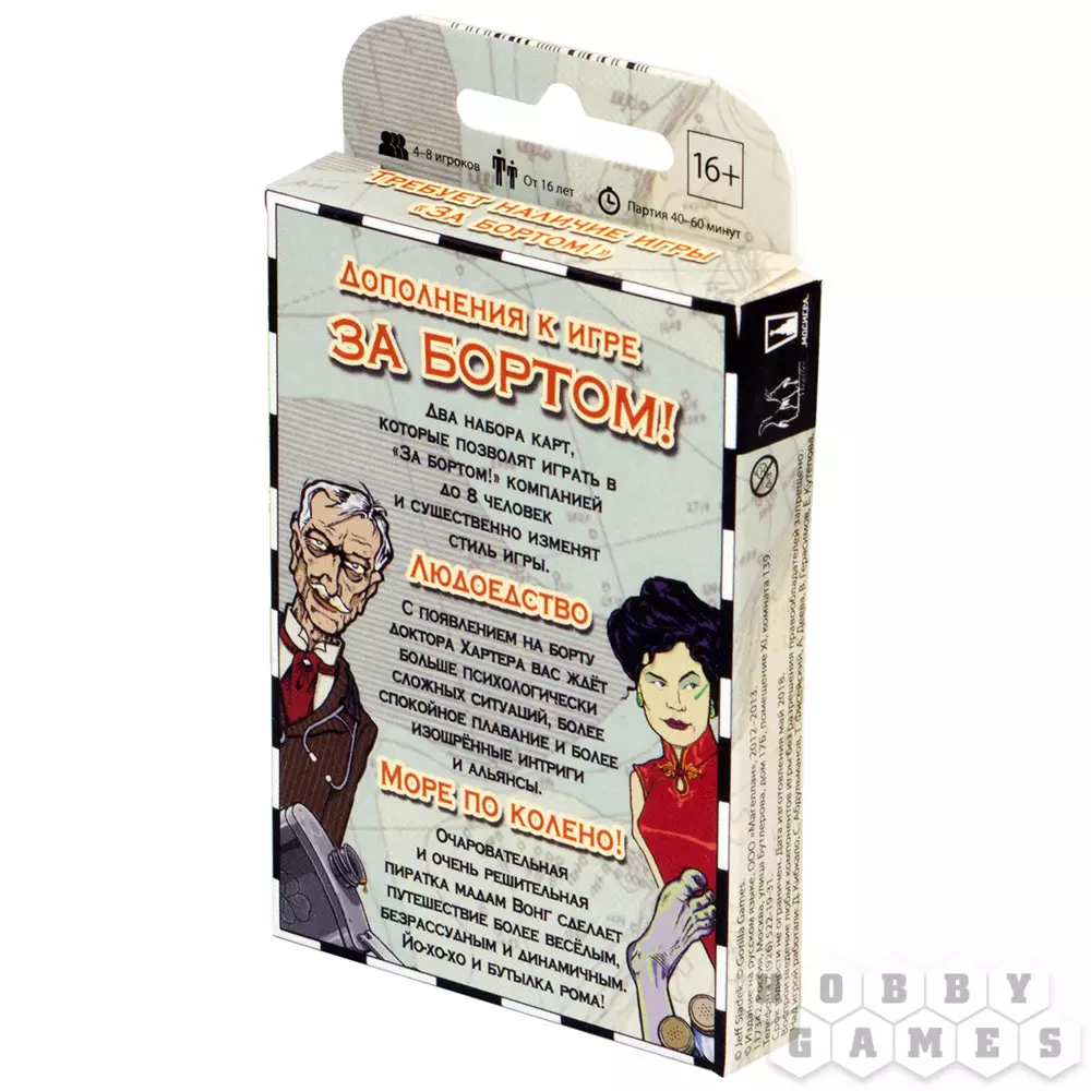 Настольная игра "За бортом" – психологическая игра для 4-6 игроков. По роковым стечениям обстоятельств, шестеро выживших после кораблекрушения делят между собой небольшую шлюпку, затерянную в неизвестных водах. Когда припасы стали подходить к концу, неожиданно оказалось, что вместо пресной воды и сухарей, кто-то сложил на шлюпку деньги, драгоценности и предметы роскоши! Жадность смешивается со страхом, дружбой и ненавистью…