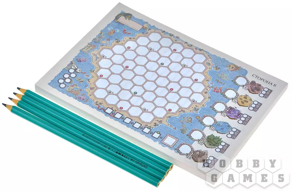 Для начала нужно вооружиться карандашами и листами острова. Стоит помнить, что листы двухсторонние – но сторона Б отличается от стороны А повышенной сложностью, так что подойдёт опытным игрокам. Следом нужно выложить четыре карты слухов, содержащих задания – и можно начинать!