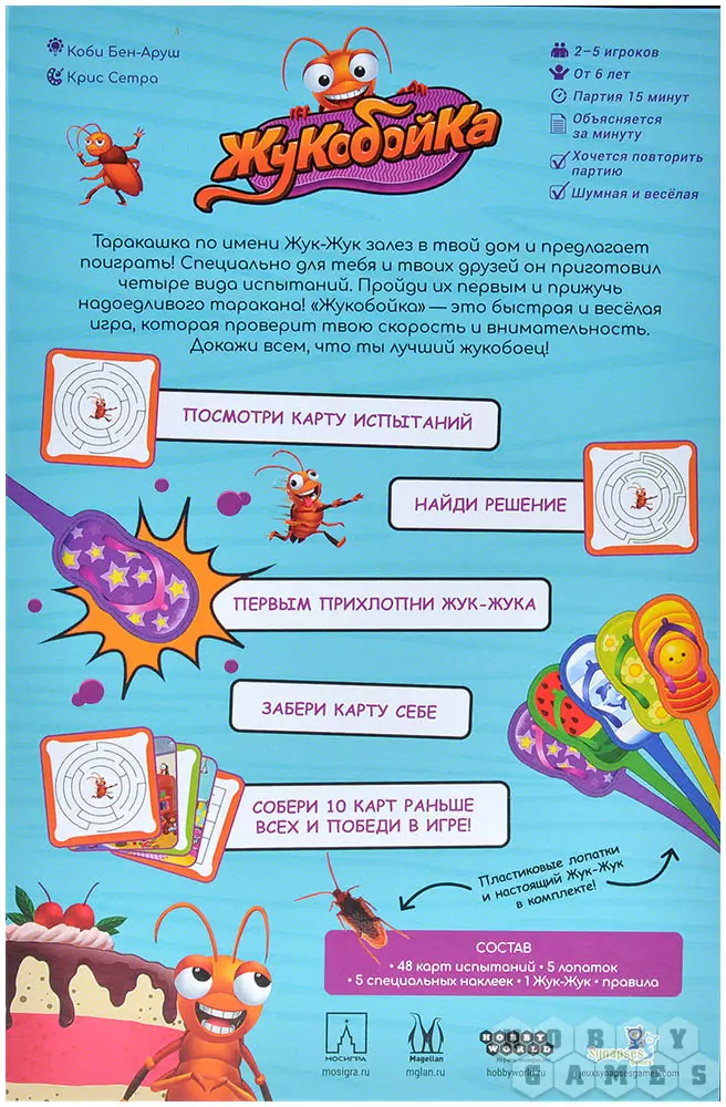 Для начала раздайте каждому игроку по лопатке – она вам понадобится, чтобы бить по пронырливому таракану в ходе игры! Перемешайте и положите колоду, а рядом с ней разместите самого Жук-Жука таким образом, чтобы всем было удобно до него дотянуться. Готовы? Можно начинать игру!