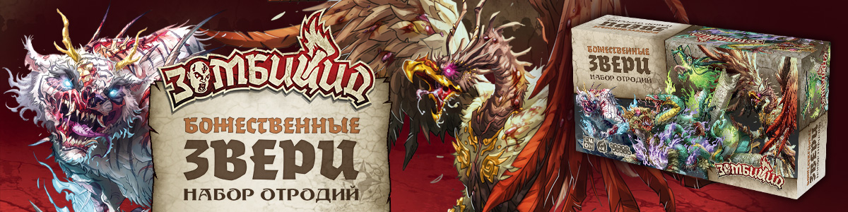 В набор "Божественные звери" входят 4 новых отродья, совместимых с "Зомбицид: Чёрная чума", "Зомбицид: Зелёная орда" и "Зомбицид: Белая смерть".