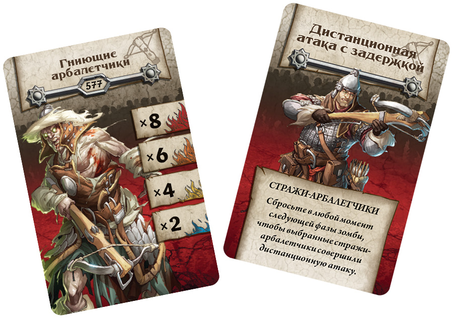 Фаза игроков – вы получаете три действия на персонажа (на старте). Двигайтесь по зонам, преодолевая стены и лестницы, но будьте осторожны – за выход из зоны с зомби придётся заплатить дополнительными действиями. Обыскивайте здания (только там, где нет врагов), чтобы находить новое оружие – от кинжалов до древковых алебард, позволяющих бить врагов издалека. Меняйтесь снаряжением с союзниками, активируйте цели или отдавайте приказы страже – эти бесстрашные бойцы могут атаковать, двигаться и даже опрокидывать котлы с кипящей смолой на орды нежити.