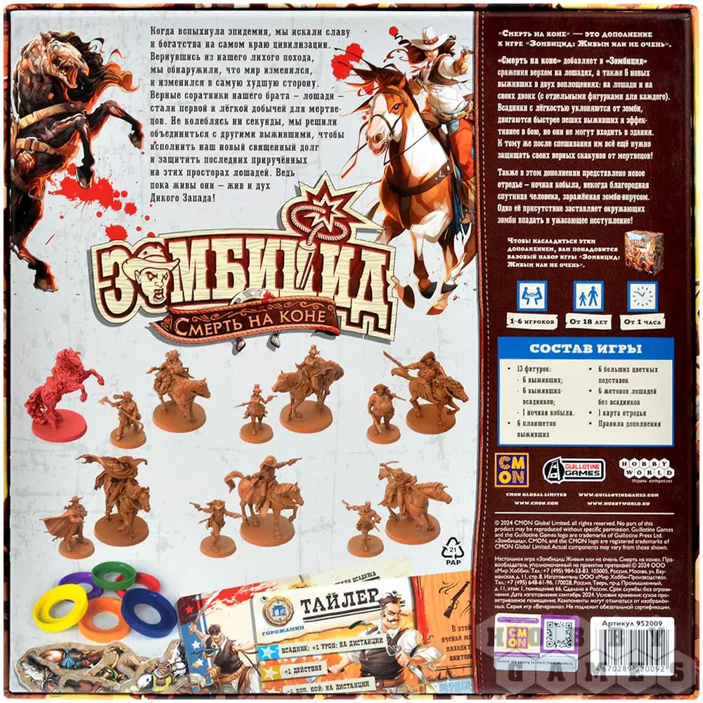 "Зомбицид: Живым или не очень. Смерть на коне" – это увлекательное дополнение к игре "Зомбицид: Живым или не очень", которое вводит в игровую механику лошадей, а следовательно, сражения верхом, ускоренное передвижение по полю, возможность более эффективного уклонения и прочие нововведения. Впрочем, как и всегда, у каждого преимущества есть своя цена: теперь вам придётся защищать не только себя, но и своего верного коня, который, к тому же, несколько ограничен в перемещении из-за своих масштабов и не может спрятаться внутри здания, как вы. А ещё в дополнении представлена особая сущность – ночная кобыла, заражённая вирусом. И будьте готовы к трудностям, если вам доведётся встретиться с ней, ведь по какой-то причине при её появлении все зомби в округе переходят в режим ожесточённого исступления...