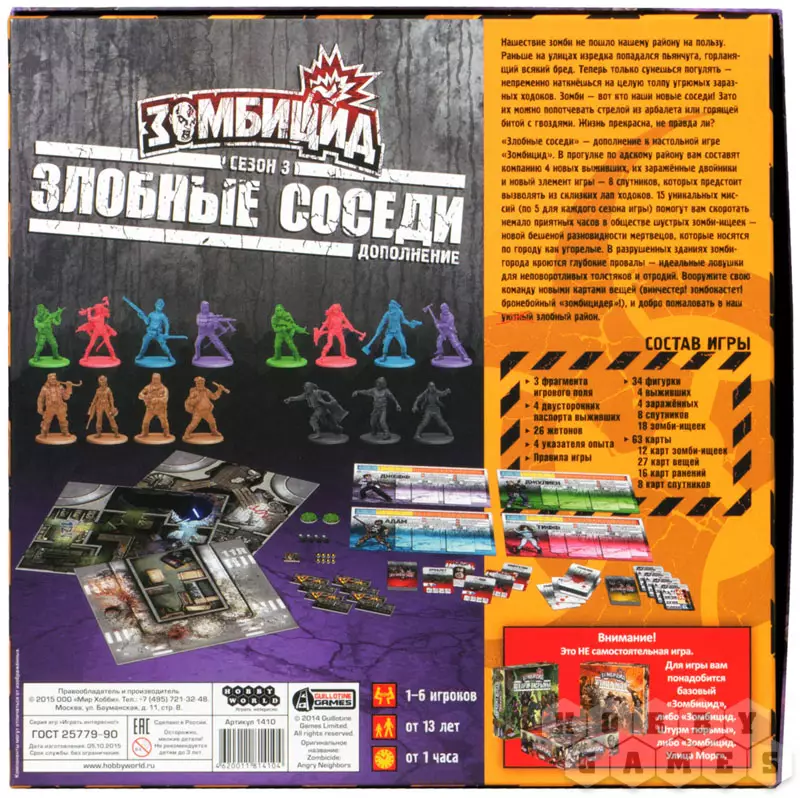 "Зомбицид" – кооперативная приключенческая настольная игра в сеттинге зомби-апокалипсиса для 1-6 игроков. Игра превратит вас в настоящих выживальцев, которым, независимо от их собственных желаний, придётся бросить вызов целым ордам оживших мертвецов. Каждая игровая миссия предложит вам свой сюжет, свои цели и особые правила. После страшной эпидемии разрешено всё – катайтесь по городам, уничтожайте пожирателей мозгов, забирайте припасы и оружие, не забывайте спасать оставшихся в живых, но главное – действуйте сообща!